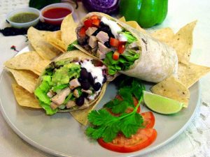 Grilled shrimp, black beans, rice, cabbage, tomatoes and ranch sauce wrapped in a grilled flour tortilla.