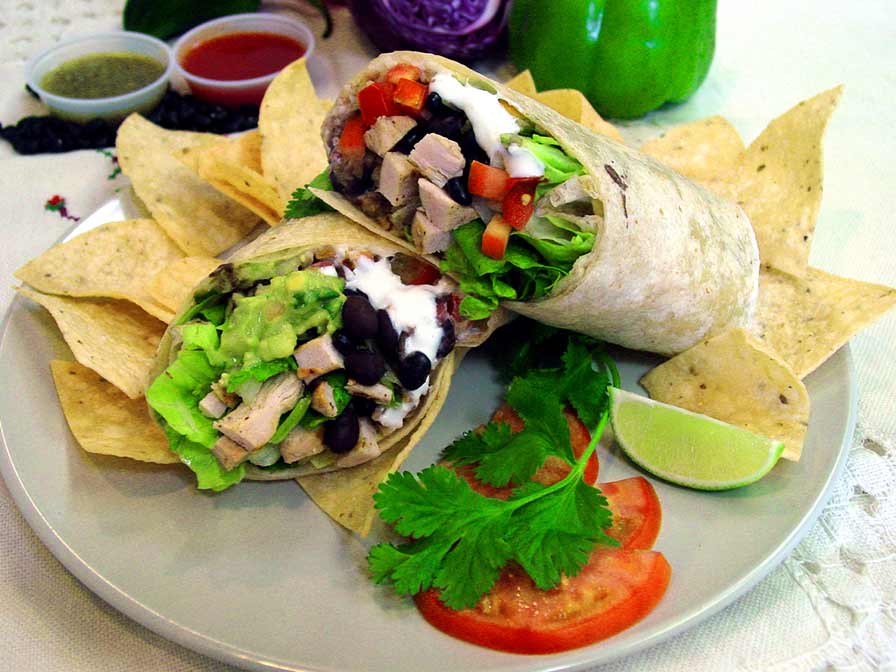 1/2 pound of meat, crispy lettuce, tomatoes, avocado, cheese and salsa fresca wrapped in a grilled flour tortilla